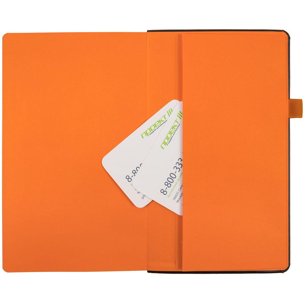 Ежедневник с полутвердой обложкой, выполнен из материала Waltz, черный АА, дополнен оранжевой резинкой с металлическим шильдом и ляссе.