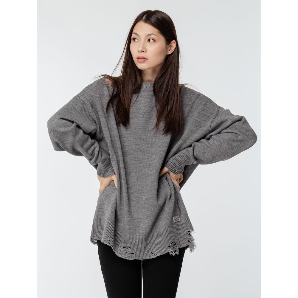 Оверсайз джемпер с круглым вырезом и рваными краями. Ворот, манжеты и низ изделия выполнены резинкой.