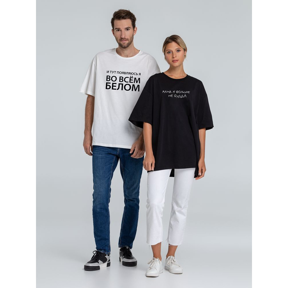 Креативная оверсайз футболка «Во всем белом» одновременно подчеркивает и чувство стиля, и чувство юмора. В этой футболке повышенное внимание к вашей персоне гарантированно.Футболка унисекс со спущенным плечом и круглым вырезом, отделанным резинкой.