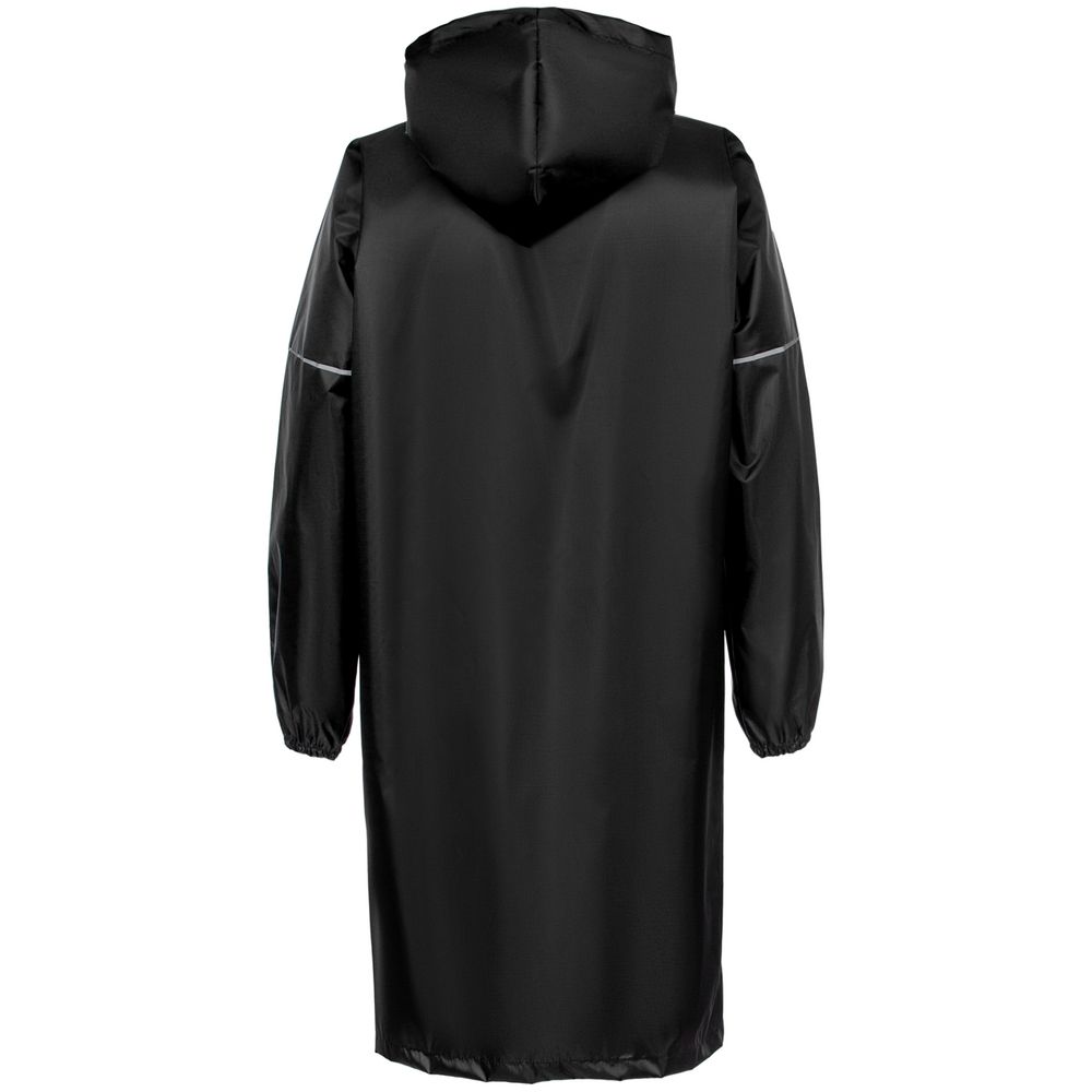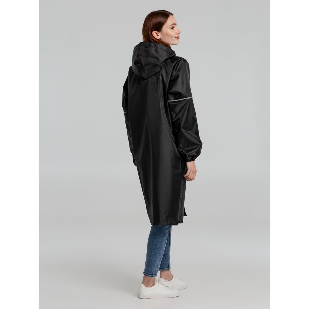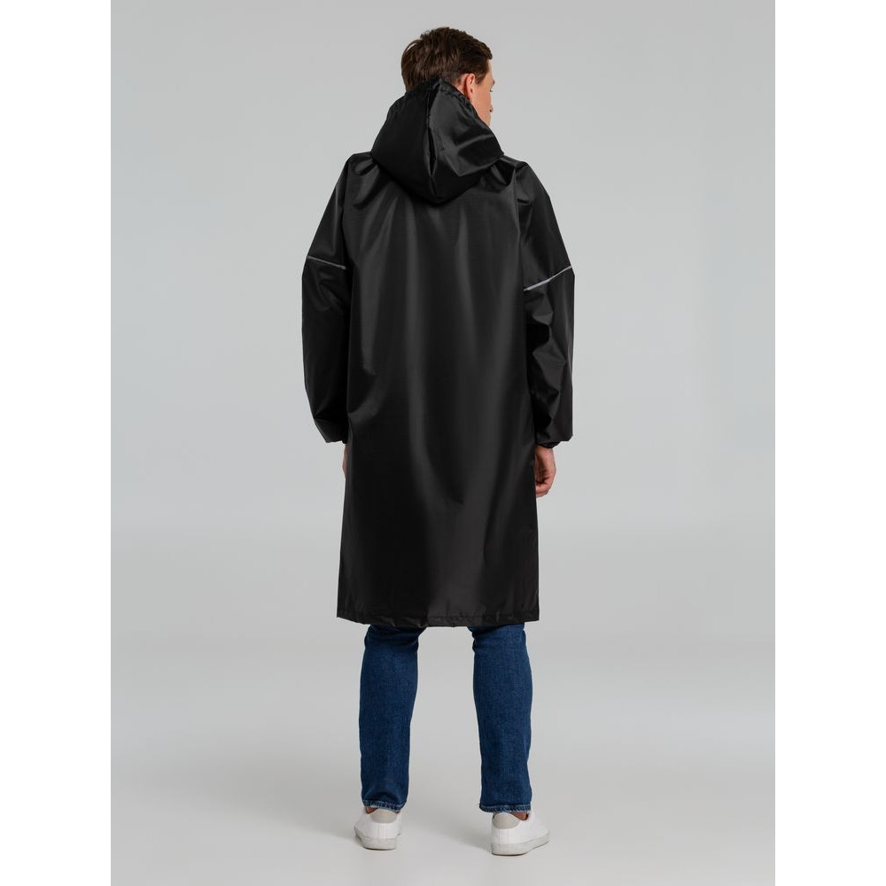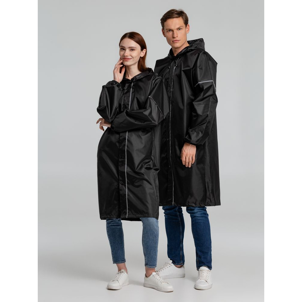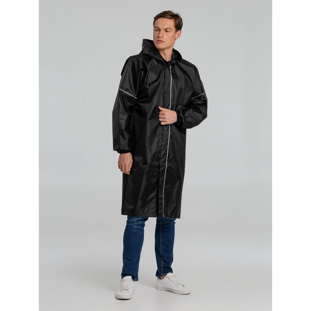 Плащ-дождевик из ткани оксфорд на кнопках с капюшоном. Световозвращающие элементы на рукавах и планке позволяют быть замеченным в темное время суток.