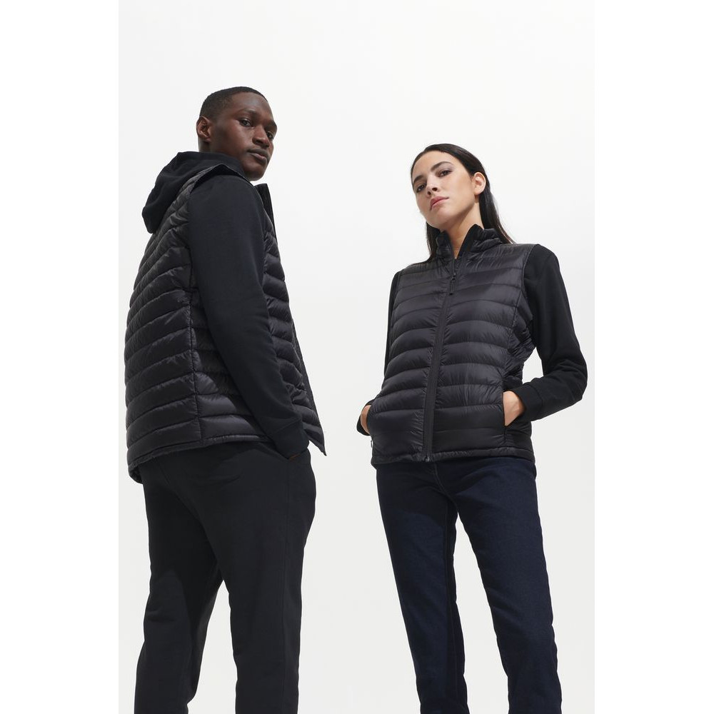 Женский стеганый жилет облегающего кроя на молнии с воротником-стойкой.