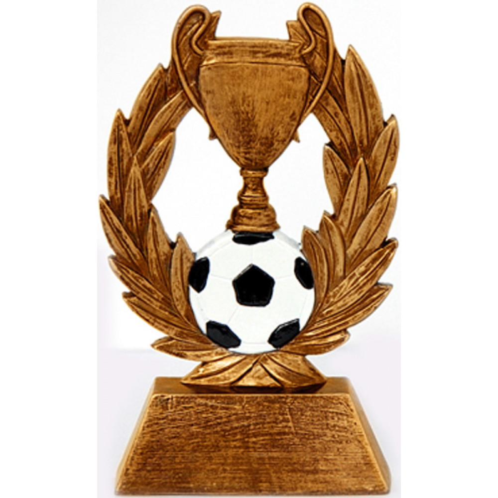 Фигурка литая "Футбол". Цвет золото. Материал: пластик. Высота 9; 13 см. Изображен кубок, стоящий на футбольном мяче бело-черного цвета. Кубок и мяч с двух сторон огибают лавровые ветви, расположенные в форме подковы. Фигурка расположена на цоколе в форме усеченной пирамиды.