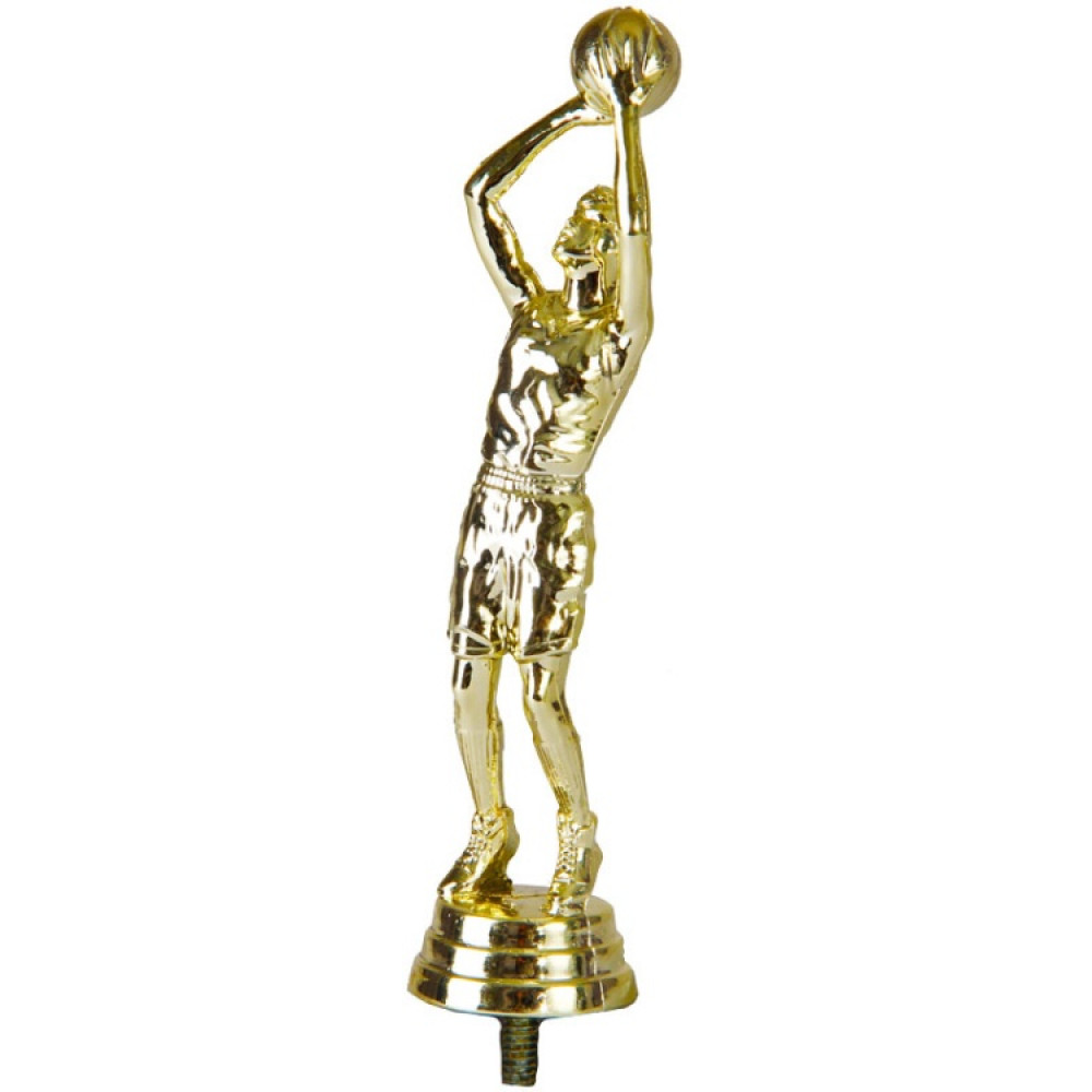 Цвет: золото, материал: пластик. Вид спорта: баскетбол. Фигурка выполнена в виде мужчины-баскетболиста, готового к броску мяча. Его руки с зажатым мячом подняты высоко над головой. Руки согнуты в локтях. На баскетболисте надета футболка и шорты, пятки оторваны от воображаемого пола. Ниже - круглое основание, на котором имеются горизонтальные линии. Высота, см: 15.9 Вес, кг: 0.035 Фигурку возможно закрепить на цоколь, постамент или кубок.