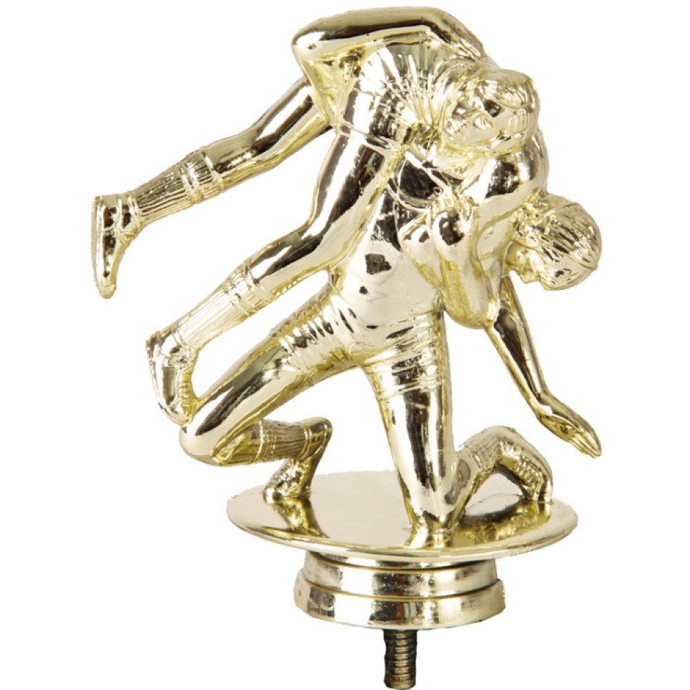 Цвет: золото, материал: пластик. Вид спорта: борьба. Фигурка выполнена в виде двух борцов, борющихся за победу. Борец снизу перекидывает второго через плечо, упираясь коленками в пол для поддержания равновесия. Борец придерживает второго борца за поясницу. Ноги поверженного зависли в воздухе перед падением. Он выставил вперёд руку в попытке удержаться, его втора рука зажата рукой противника. Благодаря деталям создаётся ощущение, что борцы сейчас начнут двигаться. Борцы находятся на тонкой круглой пластине – имитации ринга. Ниже - круглое основание, на котором имеются горизонтальные линии. Высота, см: 10.8. Фигурку возможно закрепить на цоколь, постамент или кубок.