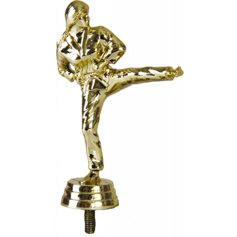 Цвет: золото, материал: пластик. Вид спорта: каратэ. Фигурка выполнена в виде фигуры женщины-каратиста. Она наносит удар невидимому противнику. Её левая рука с сжатым кулаком выставлена вперёд, а правя прижата к телу. Каратистка удерживает равновесие на одной ноге. Её левая нога согнута в колене для лучшей устойчивости. Высота, см: 12.1 Вес, кг: 0.036. Фигурку возможно закрепить на цоколь, постамент или кубок.
