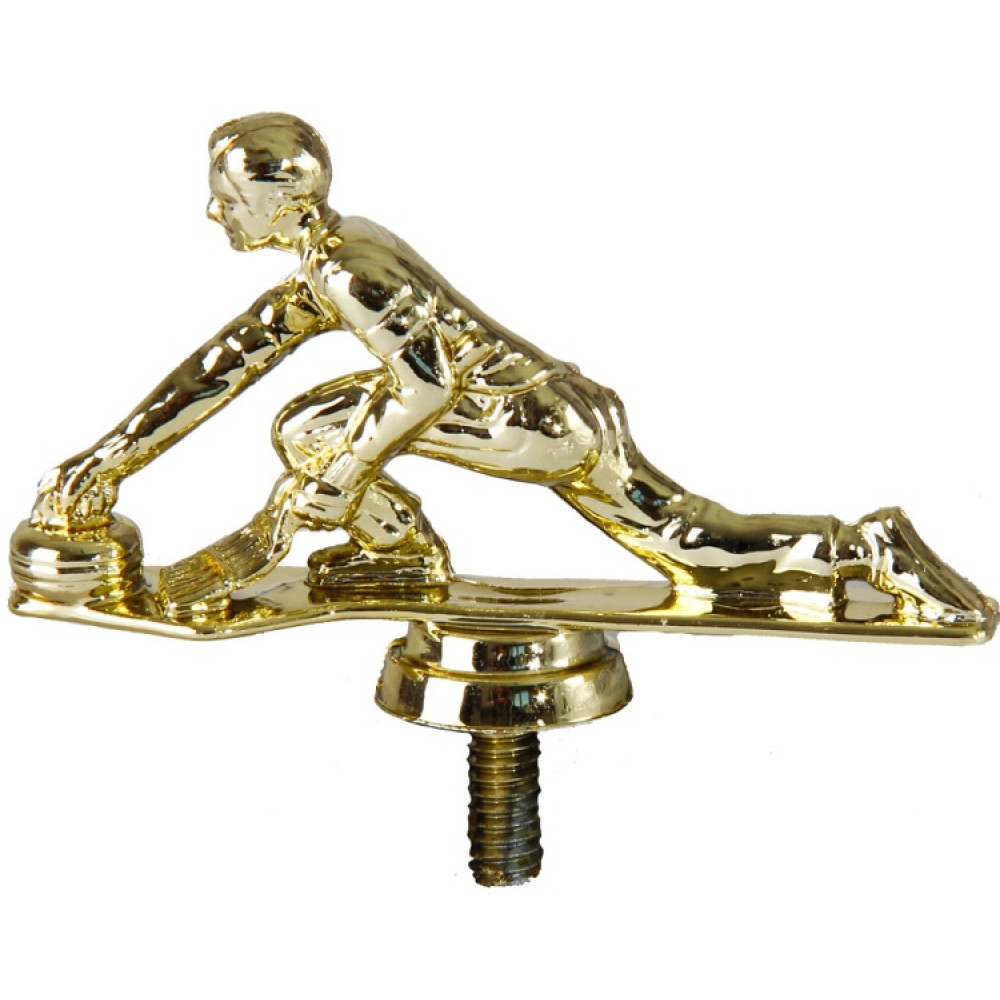 Цвет: золото, материал: пластик. Вид спорта: керлинг. Фигурка выполнена в виде мужчины-спортсмена. Его правая рука выставлена вперёд с камнем. Спортсмен натёр лёд перед камнем, чтобы создать эффект скольжения и контролировать движение камня. Его левая нога согнута в колене, правой ногой он скользит по поверхности льда. Кёрлингист находится на тонкой вытянутой пластине, которая служит имитацией льда. Ниже - круглое основание, на котором имеются горизонтальные линии. Высота, см: 5.1. Фигурку возможно закрепить на цоколь, постамент или кубок.