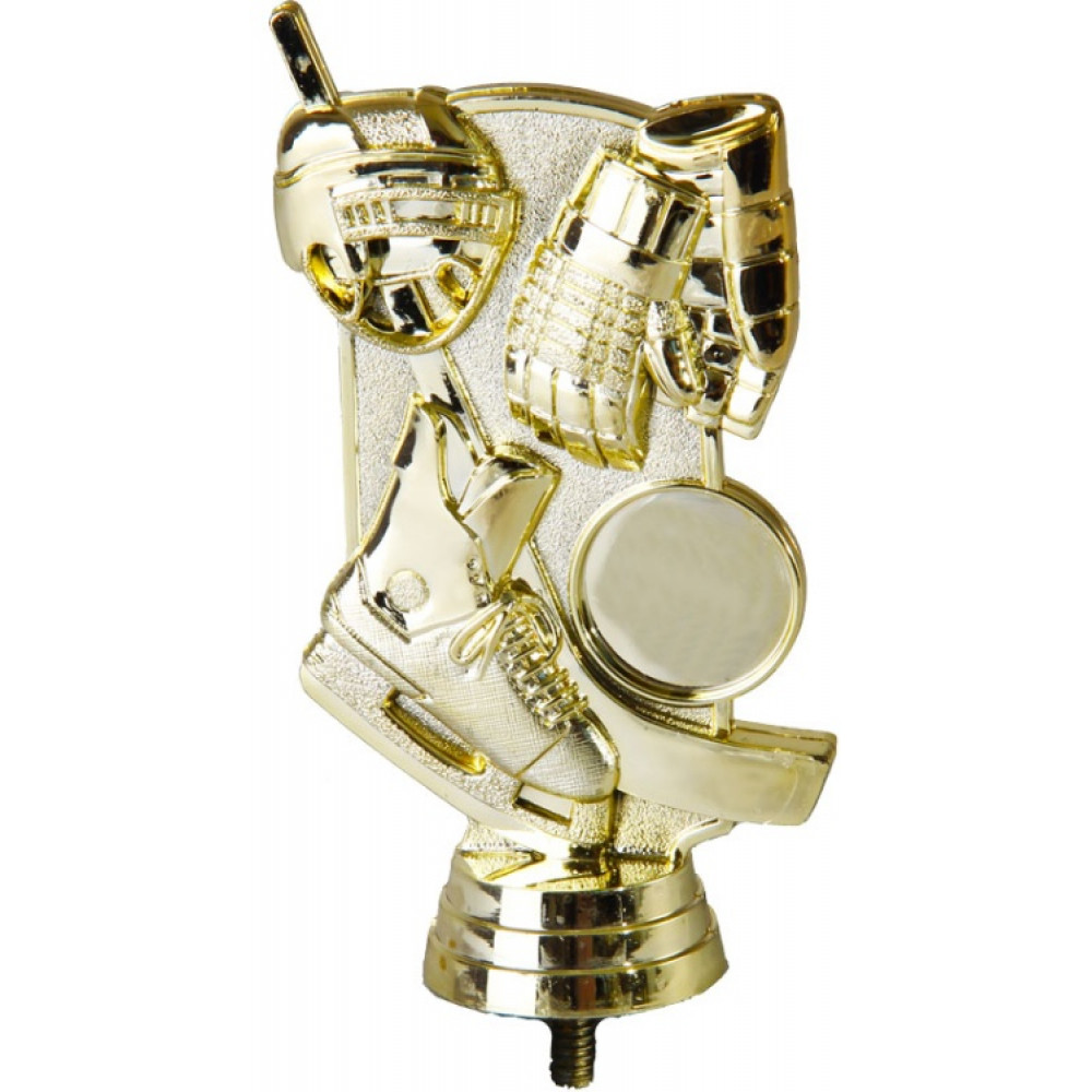 Цвет: золото, материал: пластик. Вид спорта: хоккей. Фигурка выполнена в виде прямоугольника, который является миниатюрной версией поля, покрытого льдом для игры в хоккей. На прямоугольнике изображена экипировка хоккеиста. В нижней части слева – конек, стоящий на лезвие. Рядом с ним – клюшка, вверху которой на ручке расположен шлем. Справа от клюшки выполнены объёмные краги. В середине справа имеется круглое место для нанесения персонализации. Прямоугольник, на котором выполнены элементы, покрыт шагренью. Фигурка выполнена в золотом цвете, что придаёт ей роскоши и уникальности. Ниже - круглое основание, на котором имеются горизонтальные линии. Высота, см: 12.1 Вес, кг: 0.053. Фигурку возможно закрепить на цоколь, постамент или кубок.