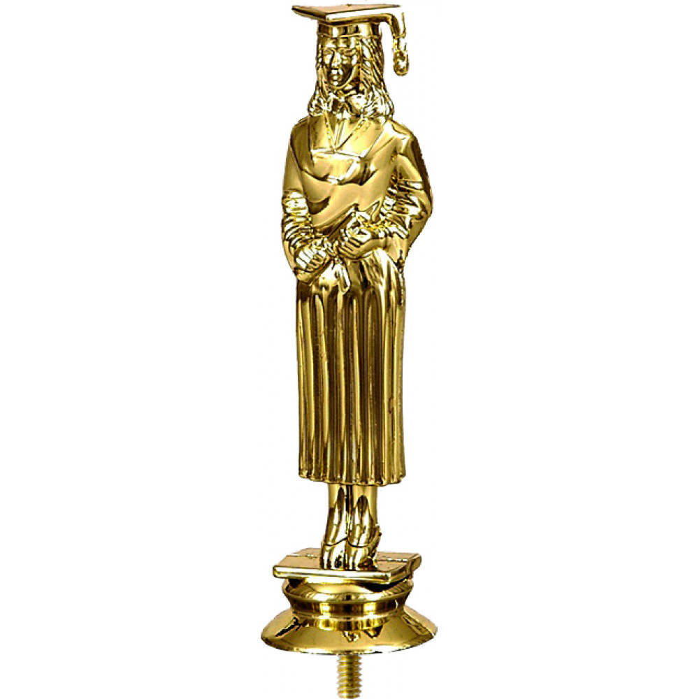 Фигурка пластиковая "Выпускница". Цвет золото. Высота 13 см. Изображена девушка, одетая в мантию и четырехугольную шляпу с кисточкой. Фигурка установлена на стеме в виде небольшого элемента конусообразной формы. Фигурку возможно закрепить на цоколь, постамент или кубок.