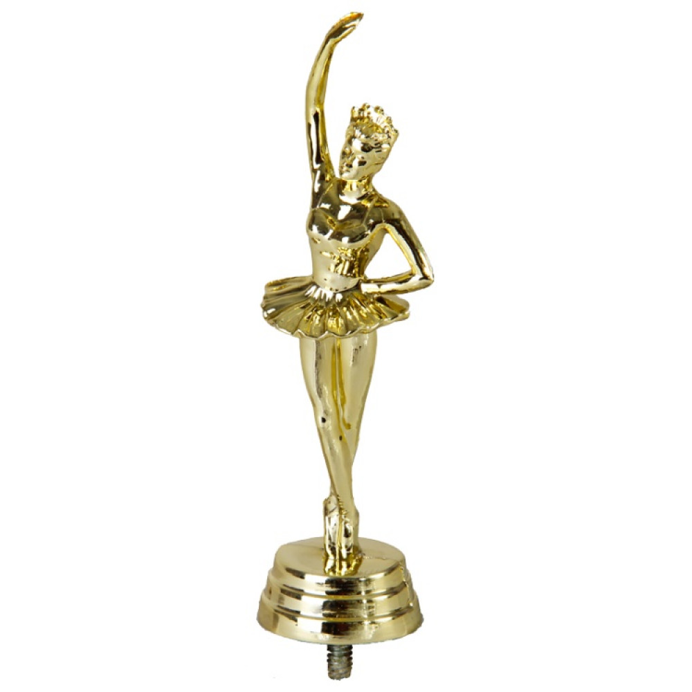 Цвет: золото, материал: пластик. Вид спорта: танцы. Фигурка выполнена в виде девушки-балерины. Одна ее рукам поднята вверх в элегантном движении, вторая находится на уровне талии. На голове девушки украшение. Балерина одета в пачку, на ногах пуанты. Высота, см: 14.6. Фигурку можно закрепить на цоколь, постамент или кубок.