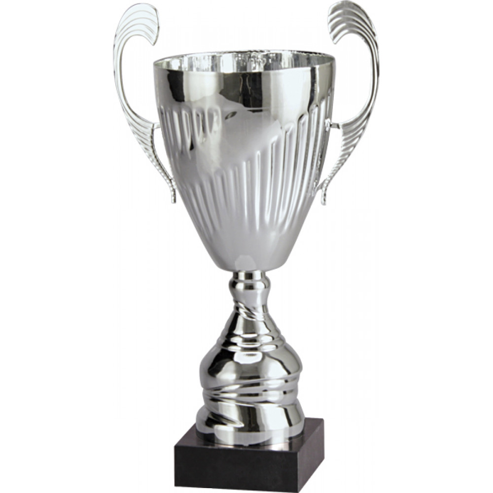 Кубок состоит из трех элементов: чаша, стем, цоколь. ¶Чаша кубка изготовлена из стали с гальваническим покрытием, цвет внутри и снаружи - серебро. К чаше прикреплены ручки, выступающие за её края. Ручки украшенные объемными линиями. Чаша гладкая, по диагонали по всему периметру чаша украшена вертикальными прерывистыми, углубленными линиями. Стем кубка изготовлен из металлизированного пластика, цвет - золото. Нижняя часть стема имеет форму конуса. По всей окружности она украшена вогнутыми линиями, идущими по диагонали по всему диаметру. Цоколь кубка квадратную форму. Материал - мрамор. Цвет - черный.