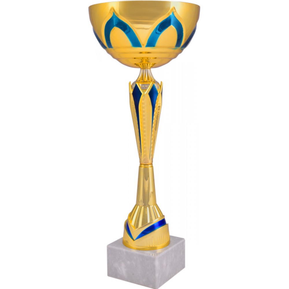 Кубок состоит из трех элементов: чаша, стем, цоколь. ¶Чаша кубка изготовлена из стали, с гальваническим покрытием. Цвет внутри и снаружи - золото. Форма чаши - полушар. Чаша имеет рельеф по всей окружности в форме куполов с контуром синего цвета, в количестве 6 штук. Под куполами у основания чаши расположены вдавленные линии, идущие по окружности.¶Стем состоит из трех элементов, цвет золото. Верхняя часть стема в форме конуса с рельефными вертикальными полосками одинаковой длины, переходящие в широкое кольцо с орнаментов в виде точек по низу по всей окружности. Средняя часть стема имеет форму перевернутого конуса. В верхней части элемента расположены выступающие треугольники синего цвета в количестве 6 штук по всей окружности. Нижняя часть стема имеет конусообразную форму. Внизу расположен вогнутый элемент в форме "галочки" синего цвета.¶Цоколь кубка имеет квадратную форму. Материал - мрамор. Цвет - белый, неоднородный.