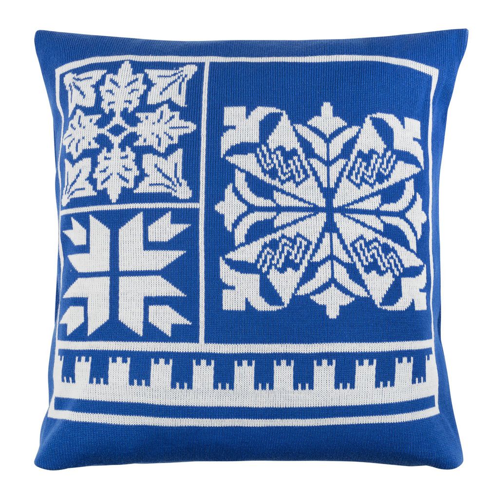 Вязаная наволочка надевается на подушку из спанбонда, наполнитель — синтепон.