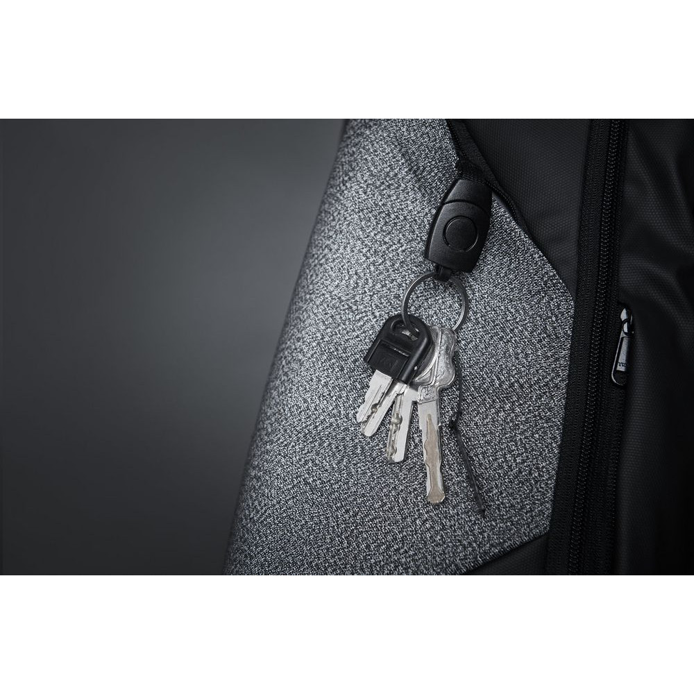 - На внешней стороне рюкзака в стыке серого и черного цвета спрятался треугольный карман на молнии с застежкой фастекс для ключей, которая позволяет легко отстегнуть или пристегнуть ключи