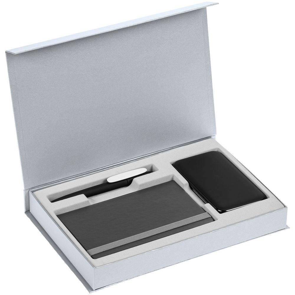 Коробка Silk с ложементом под ежедневник 10x16 см, аккумулятор и ручку, серебристая