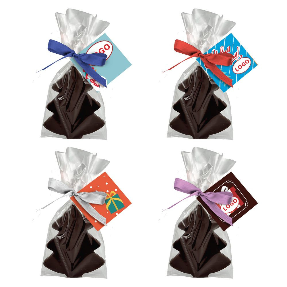 Упакована в прозрачную пленку с биркой и цветной ленточкой. Полноцветная печать на бирке с одной стороны входит в стоимость изделия.Шоколадная фигурка (35 г) из темного шоколада, 56% какао. Шоколад изготовлен из сырья бельгийской компании Barry Callebaut.