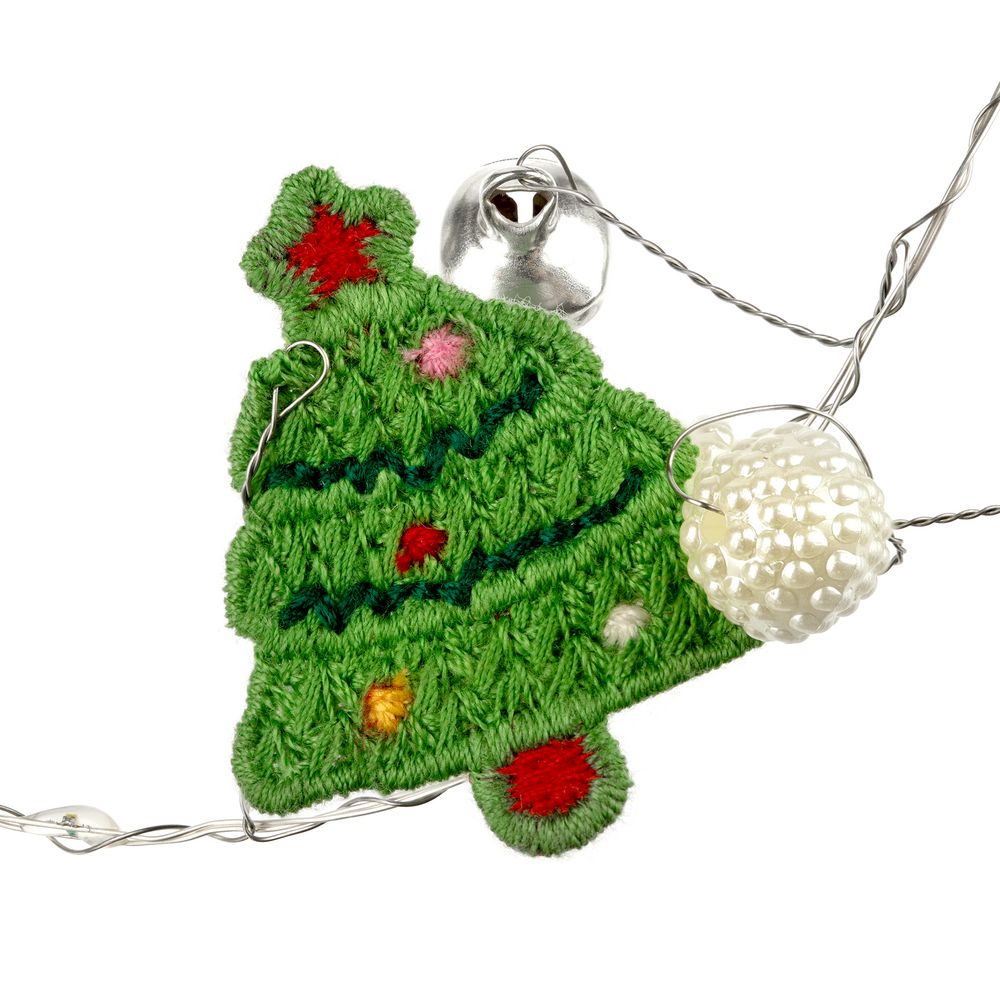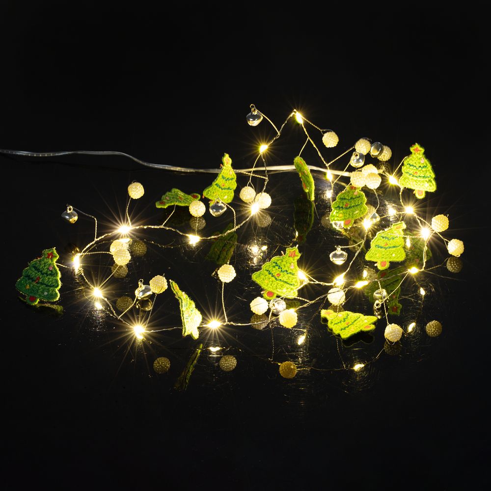 10 елочек, бусины и 20 лампочек с теплым светом. Работает от 2 батареек АА (в комплект не входят).