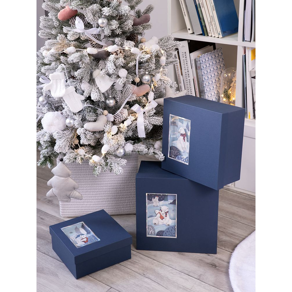 Элегантная коробка из переплетного картона The Blue Bear станет настоящим украшением зимних праздников. Ее главная изюминка — очаровательное окошко с 3D-иллюстрацией, которое словно приглашает в мир новогодних чудес.