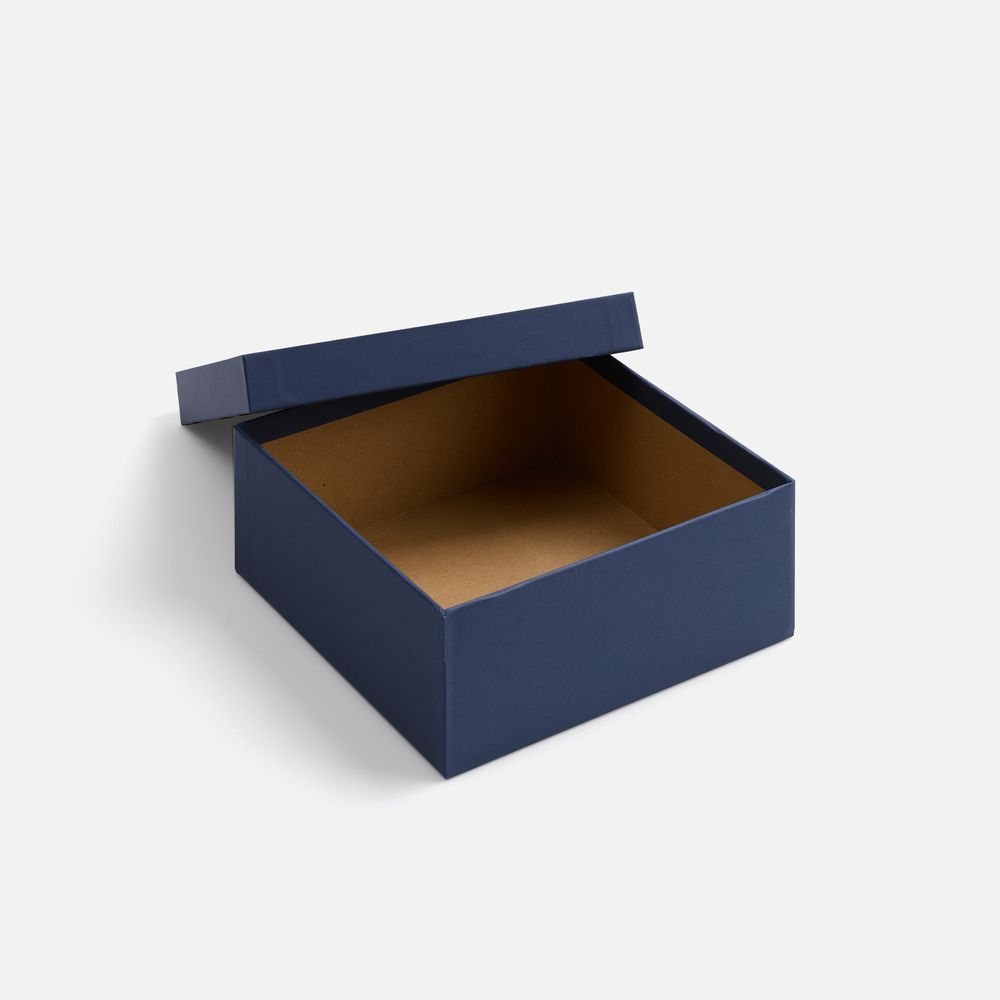 Коробка из переплетного картона, кашированного синей дизайнерской бумагой.
