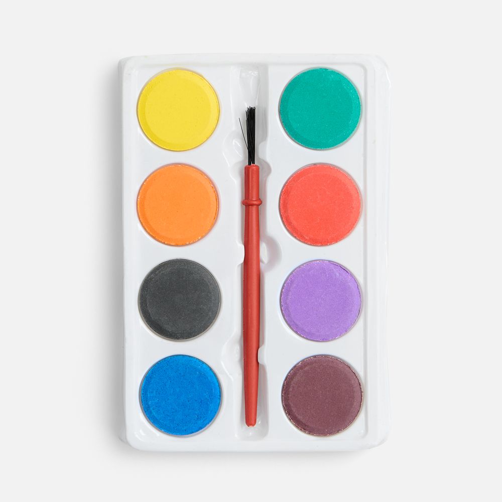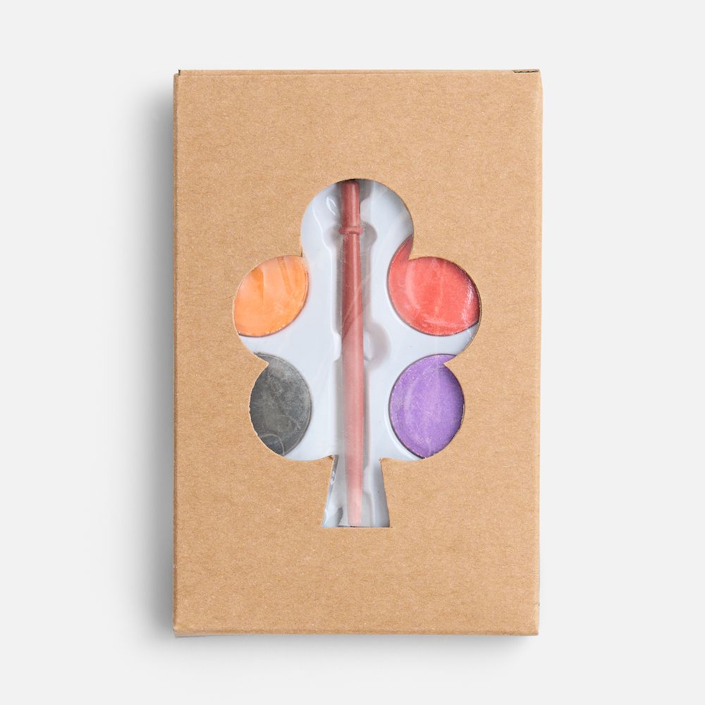 Набор из 8 акварельных красок и кисточки в коробке из крафт-бумаги.