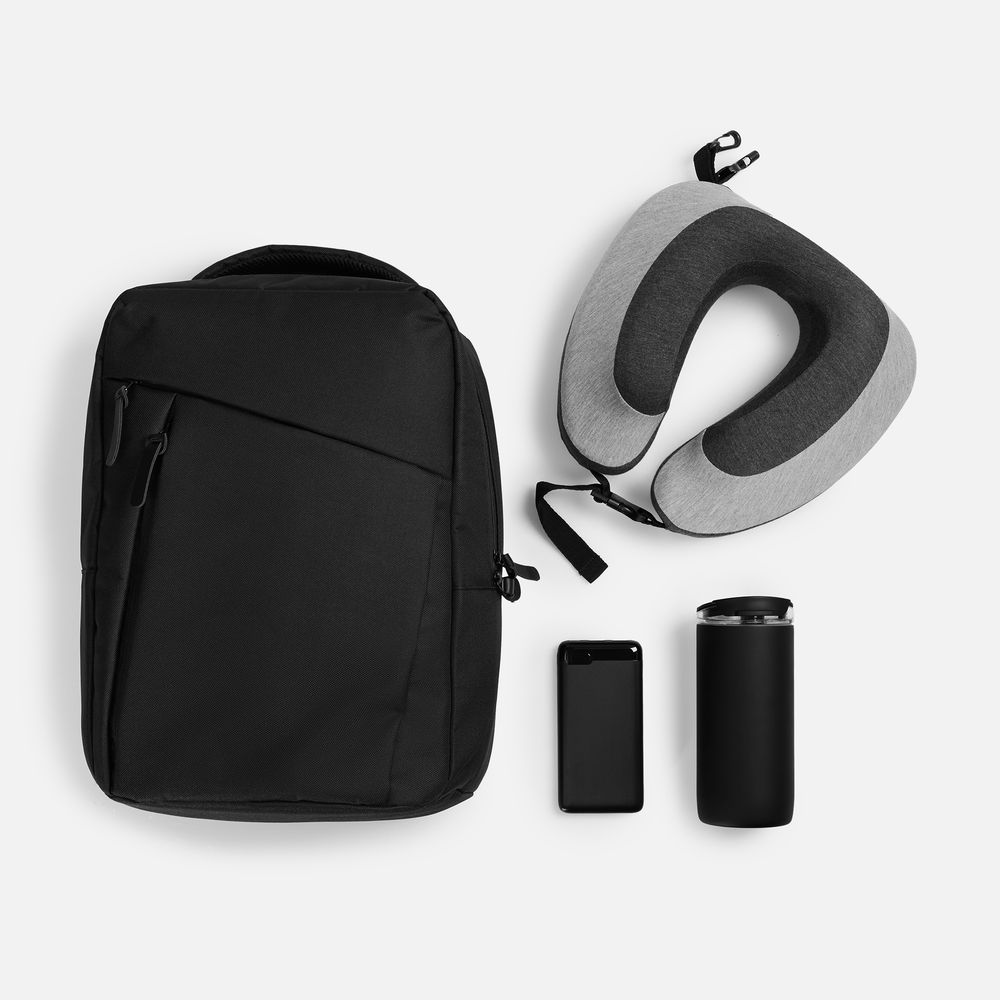 Этот стильный комплект включает в себя все необходимое для комфортных путешествий: практичный рюкзак, мощный внешний аккумулятор, уютную дорожную подушку и термостакан.