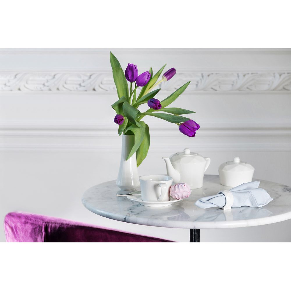 Линейка столовой посуды Diamante Bianco — настоящий бриллиант коллекции Altavolo. Структура и пропорции граней блюдец в точности повторяют верхнюю часть бриллианта классической огранки — корону. Присмотритесь — и вы увидите, как играет свет на молочно-белом фарфоре.В набор входят две чайные пары (220 мл).