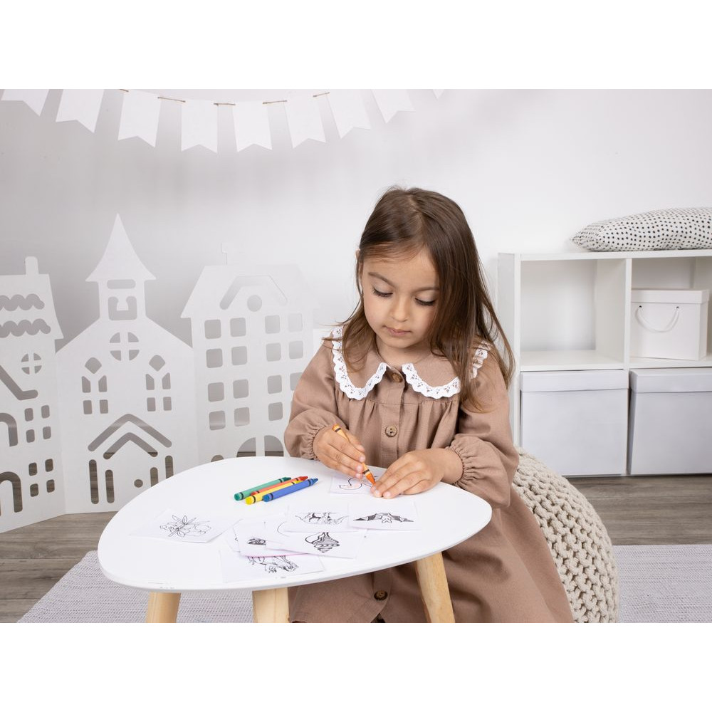 В комплекте 5 цветных восковых мелков и 20 листов с картинками для раскрашивания.