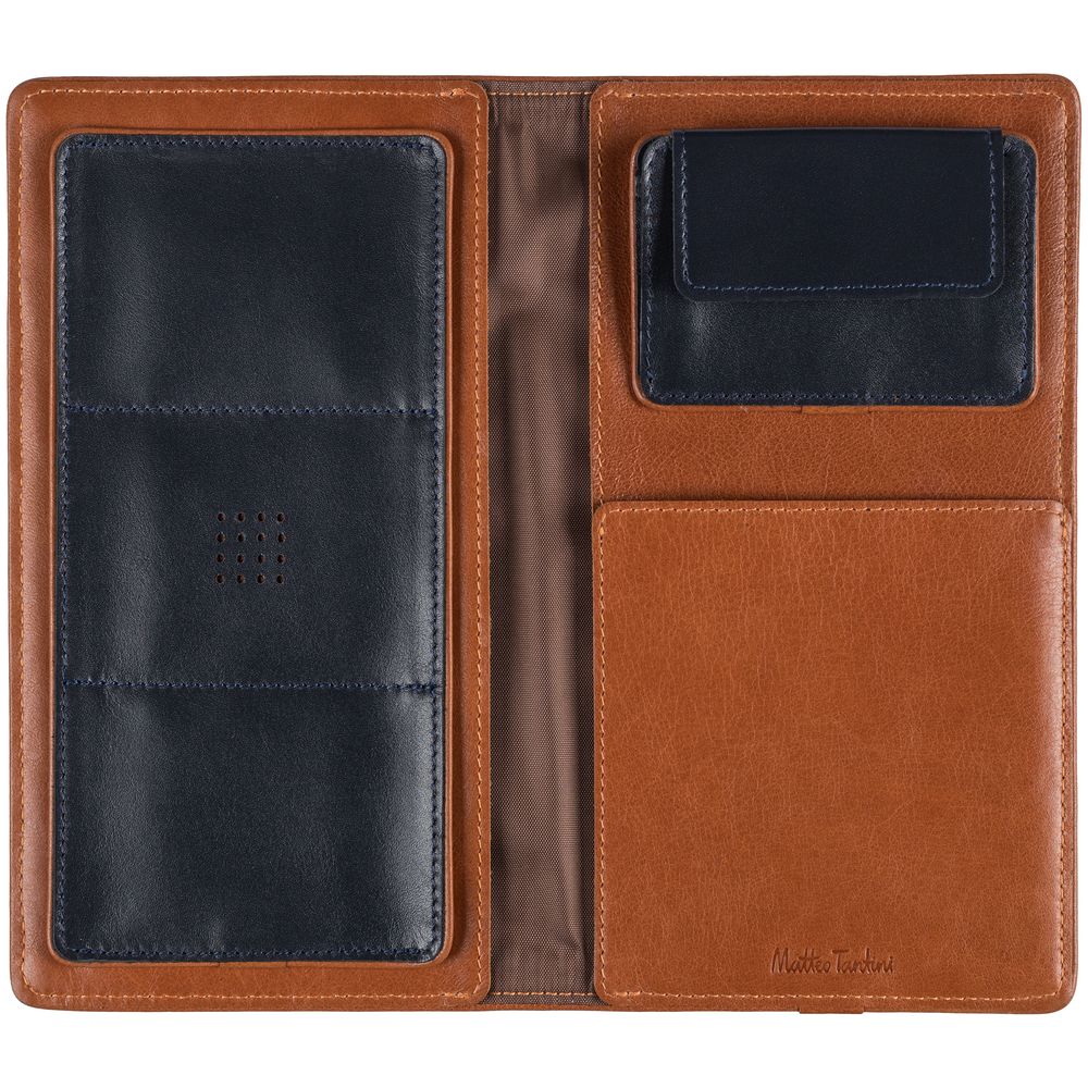 Чтобы передать этот удивительный контраст, для изделий Kalsa Palermo была выбрана гладкая натуральная кожа: глубокого синего цвета снаружи и светло-коричневого оттенка внутри. Оформленные в едином стиле, они легко собираются в подарочные наборы.