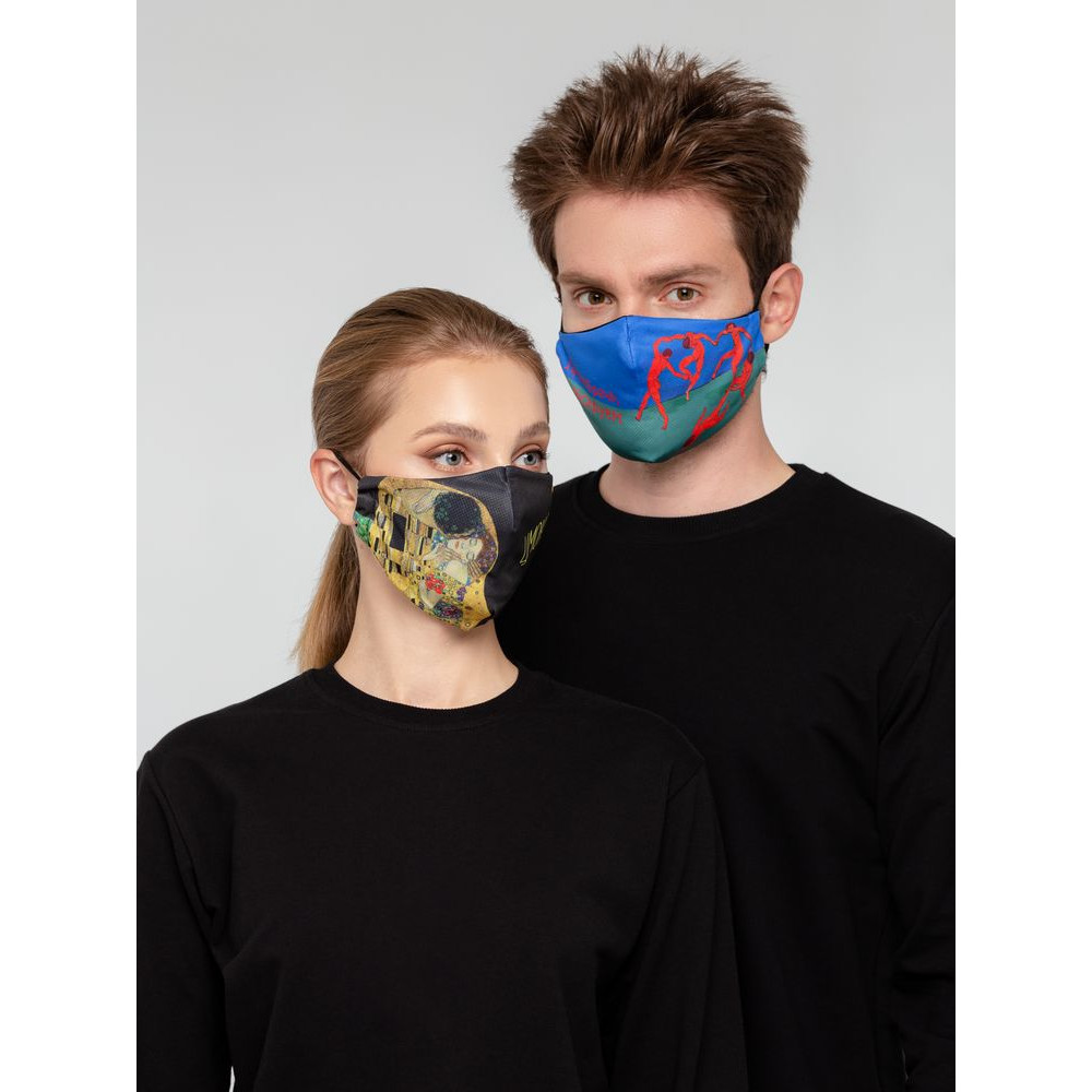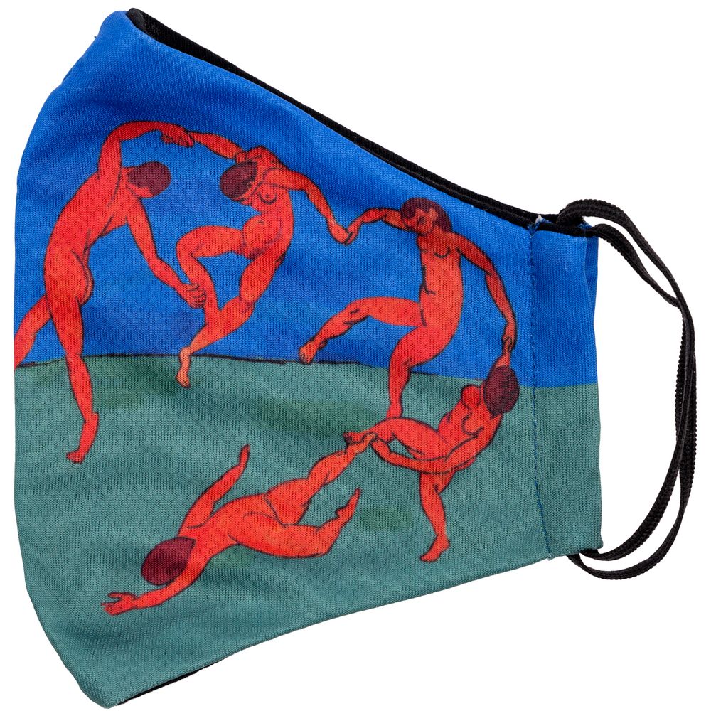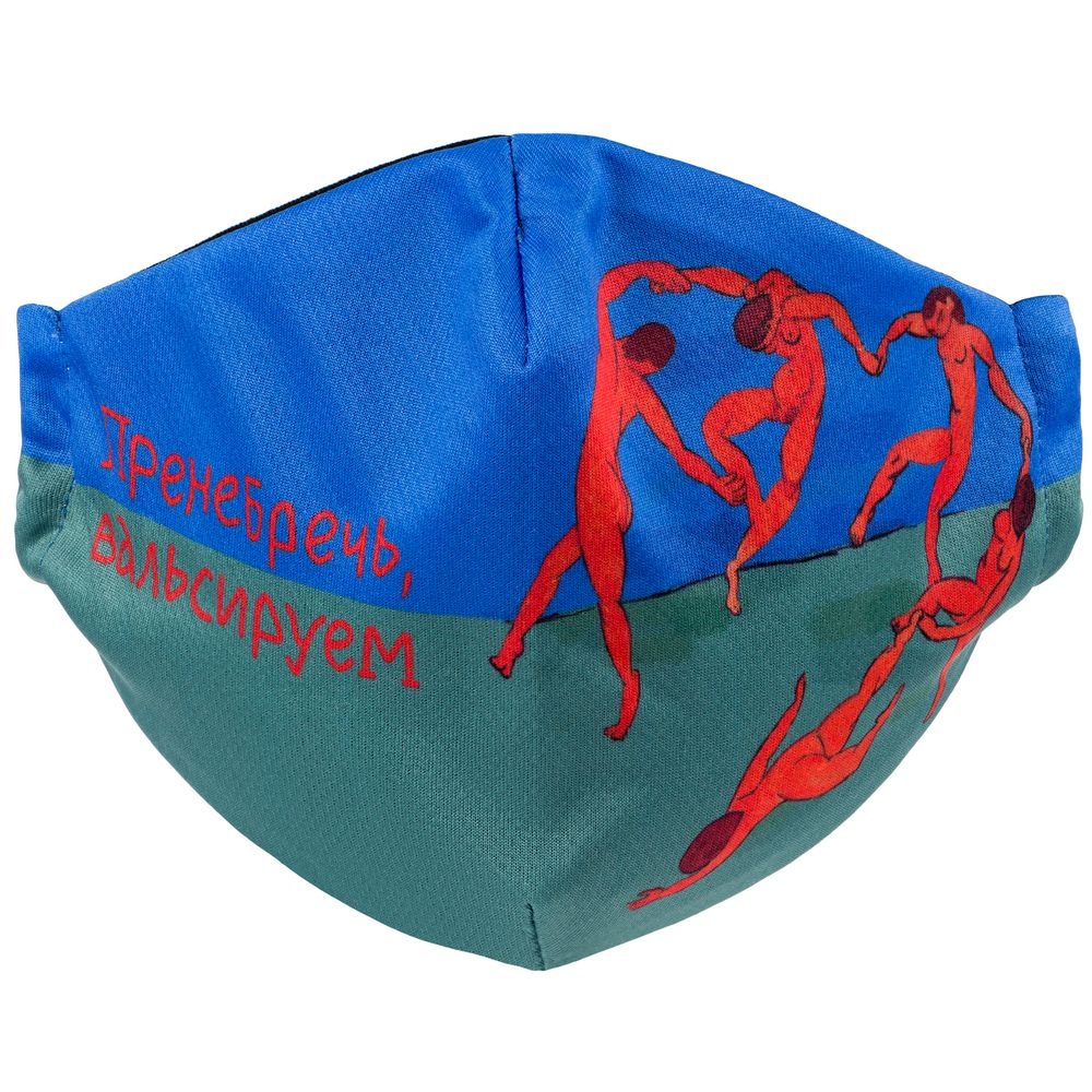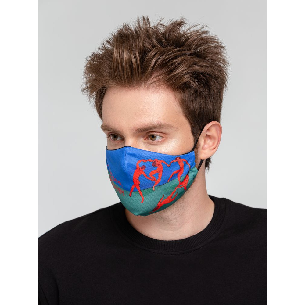 Принт создан по мотивам знаменитой картины Анри Матисса «Танец».Многоразовая маска из дышащей ложной сетки с ярким принтом с гигиенической хлопковой подкладкой и заушниками-резинками.