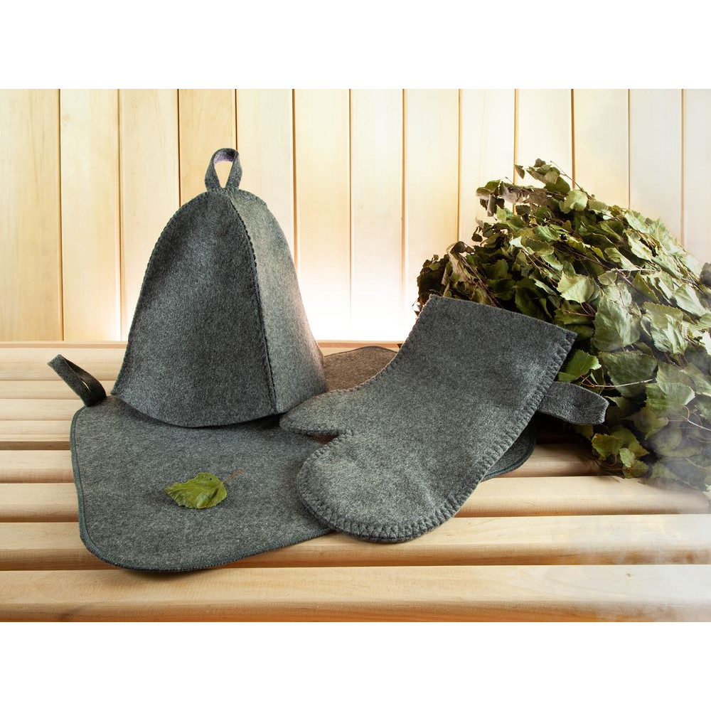 Банный набор «Парилка» станет отличным подарком для любителей отдыха в бане или сауне. Войлочная шапка защитит голову и волосы от высоких температур при банных и SPА-процедурах, коврик позволит с комфортом отдыхать на горячих полках, а рукавица — безбоязненно поддать пару или закрыть заслонку печи.