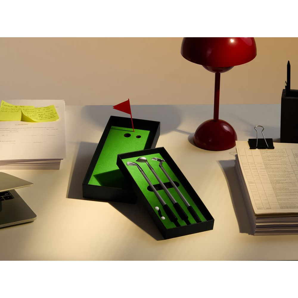 В комплекте: 3 клюшки-ручки со сменным стержнем с синими, черными и красными чернилами, 2 мячика для гольфа, флажок и подарочная коробка.