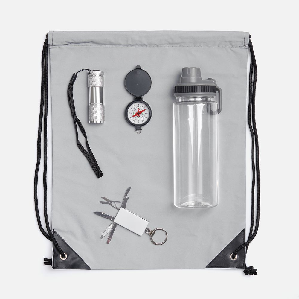 Набор Manifestour — практически survival kit для вылазки на природу! Входящие в состав брелок-мультитул, компас, бутылка для воды и фонарик — незаменимые вещи в любом путешествии, а благодаря рюкзаку из светоотражающей ткани вас будет легко заметить в темное время суток.