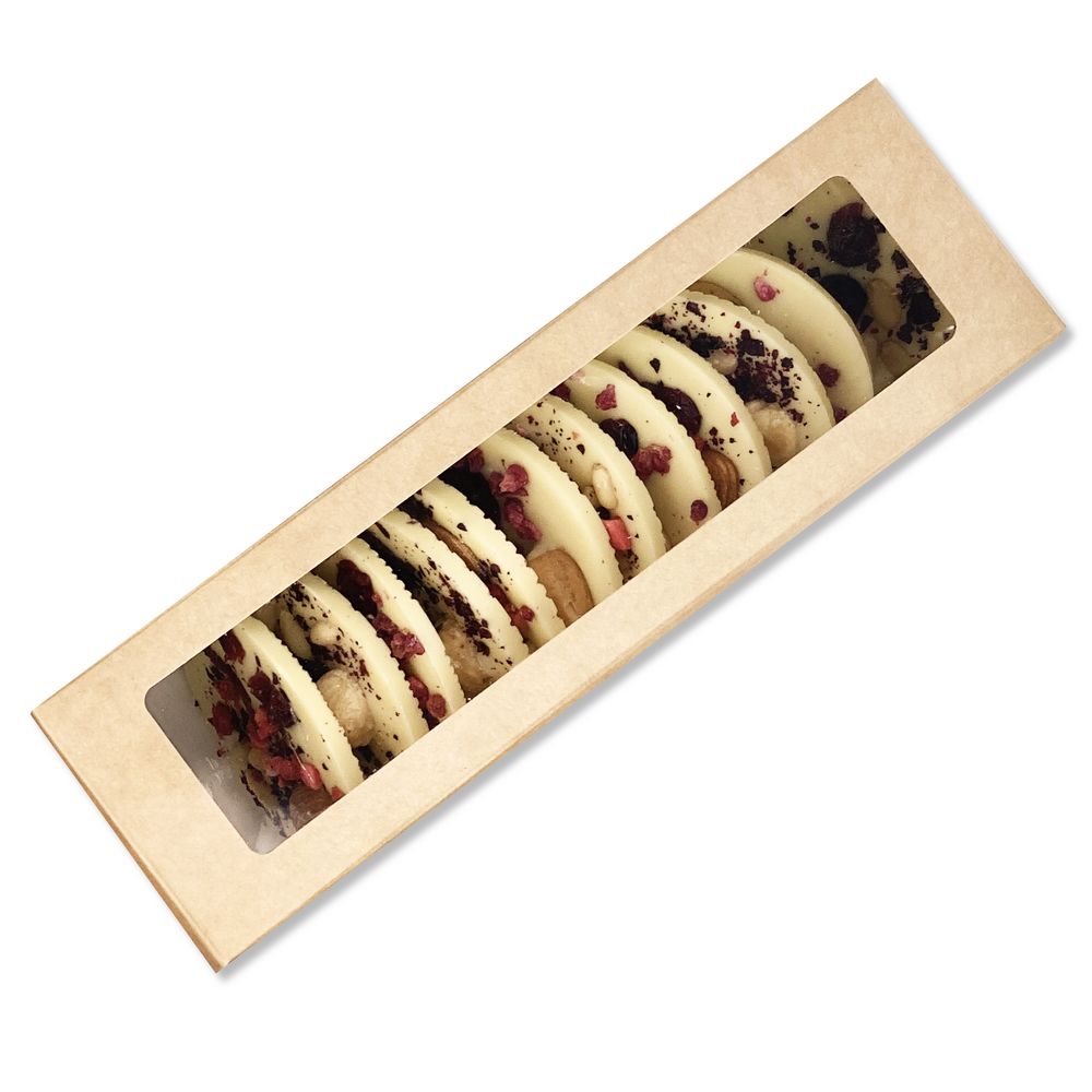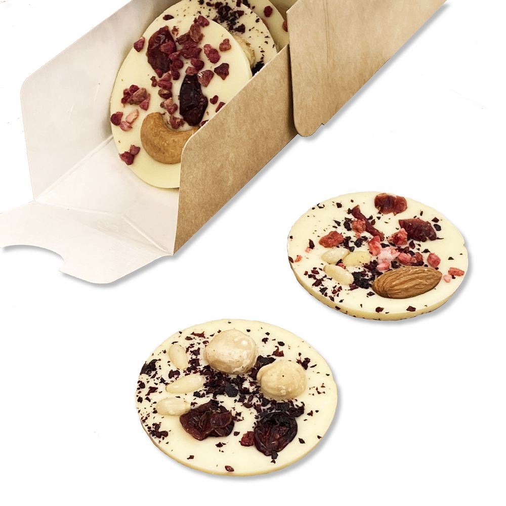 В наборе 12 медиантов из белого шоколада с посыпкой из сублимированных ягод и орехов.