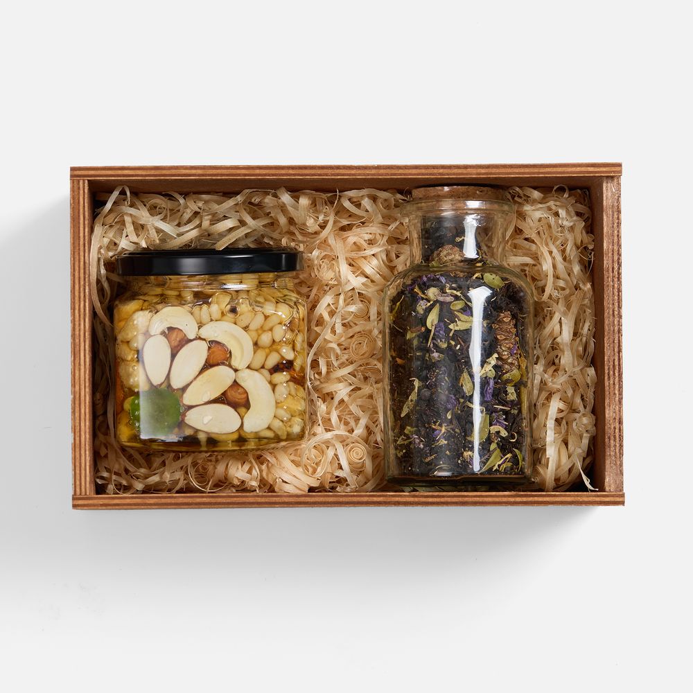 Все упаковано в аккуратный деревянный ящик: такой набор станет практичным подарком или приятным дополнением к вечернему чаепитию для тех, кто любит наслаждаться натуральными вкусами в уютной атмосфере.