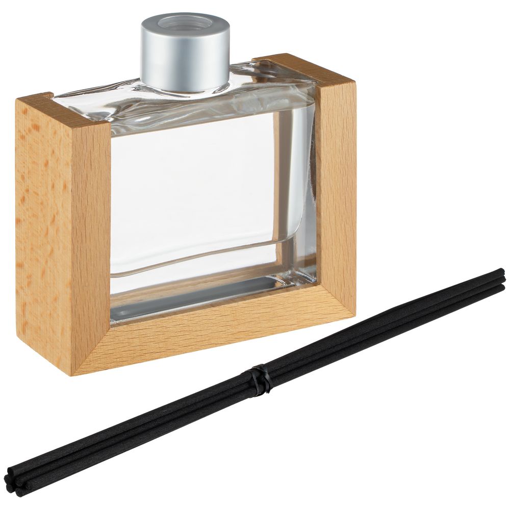 Изящный стеклянный флакон в обрамлении натурального дерева станет стильным элементом декора.