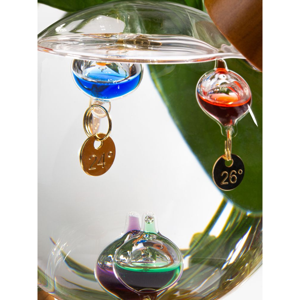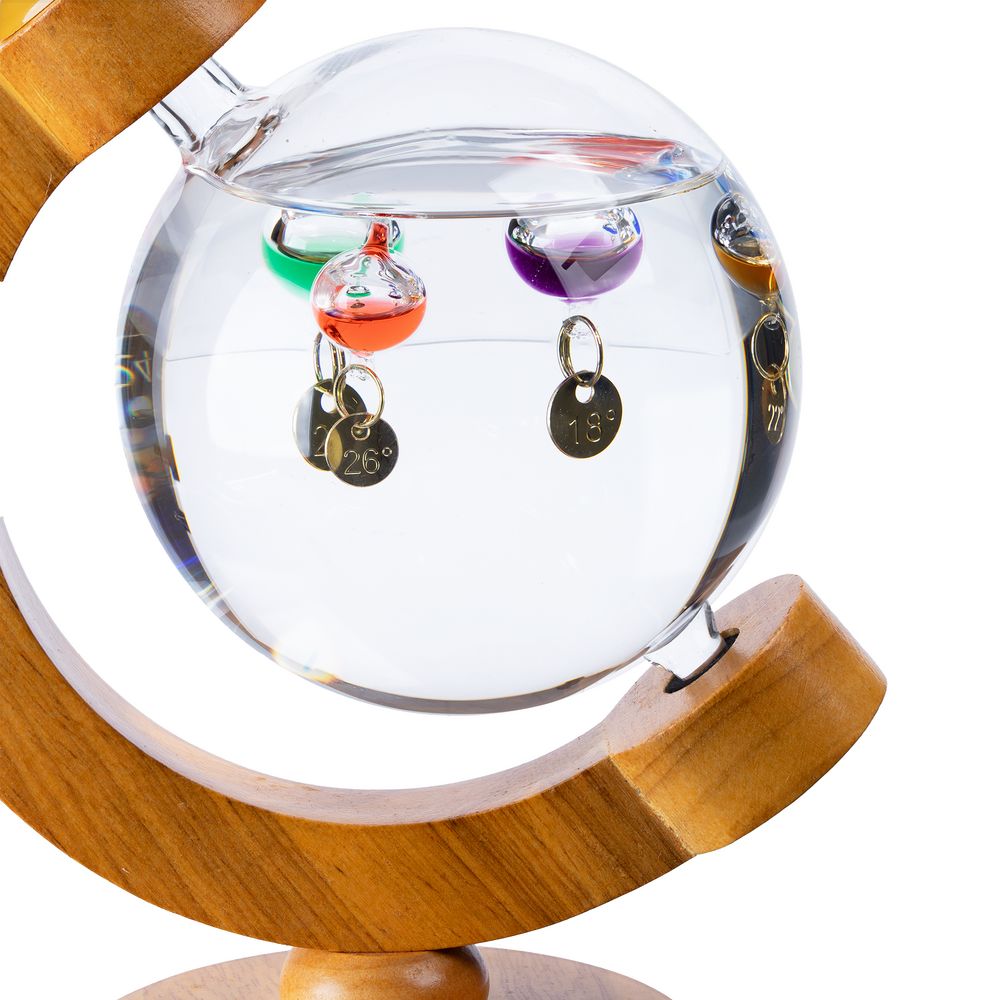 Термометр Галилео оригинальной формы, напоминающей глобус, добавит индивидуальности домашнему или офисному интерьеру. В основе его работы лежит физическая закономерность, впервые отмеченная великим Галилео Галилеем: плотность жидкости увеличивается при снижении температуры и уменьшается при ее повышении. И теперь стеклянные шарики в жидком парафине не только радуют глаз, но и позволяют с легкостью определить температуру в помещении.