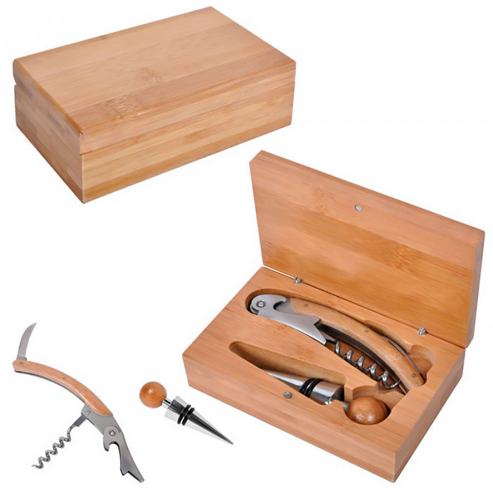 Стильный набор для вина в коробочке из бамбука – одного из самых востребованных материалов для кухонных принадлежностей.