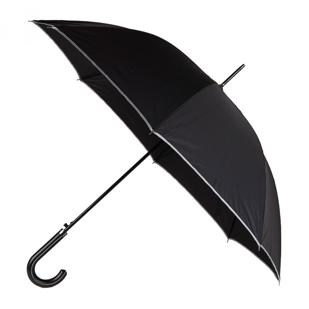 Зонт с 8 панелями, выполненный в элегантном черном цвете с серой окантовкой. диаметром 100 см, с автоматическим открыванием, из прочного материала эпонж. С металлическими ребрами черного цвета, застежкой на липучке и ручкой из мягкой на ощупь искусственной кожи.